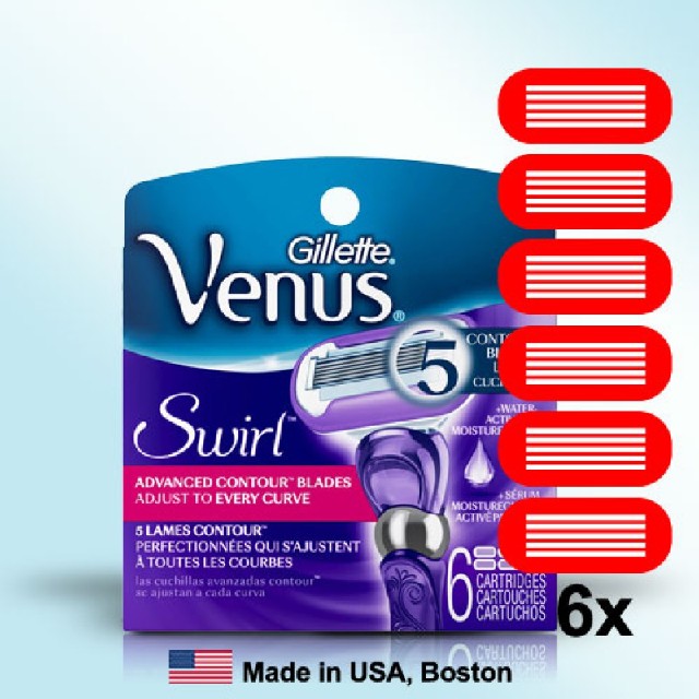 Gillette Venus Swirl náhradní hlavice 6 ks.Holící lišty na hlavici jsou 6x měkčí než u jiných Venus hlavic.Venus Swirl má vodou aktivovaný MoistureGlide sérum pro hladší skluz a oholení.