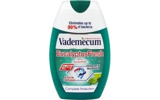 Vademecum 2v1 Menthol Fresh 75ml zubní pasta s příchutí eucalyptu.Vademecum Menthol Fresh je první kombinací osvědčené zubní pasty Vademecum a ústní vody. Tekutá konzistence se snadno dostane i do obtížně dostupných míst v ústech a zbaví je bakterií.